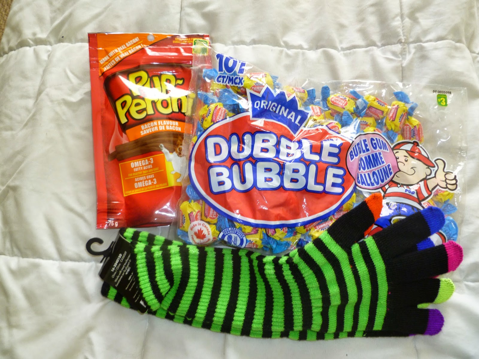 Next these are some random gifts from are friend Dave some dog treats for Jin , dubble bubble gum to snack on and these gloves.